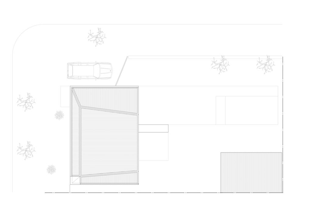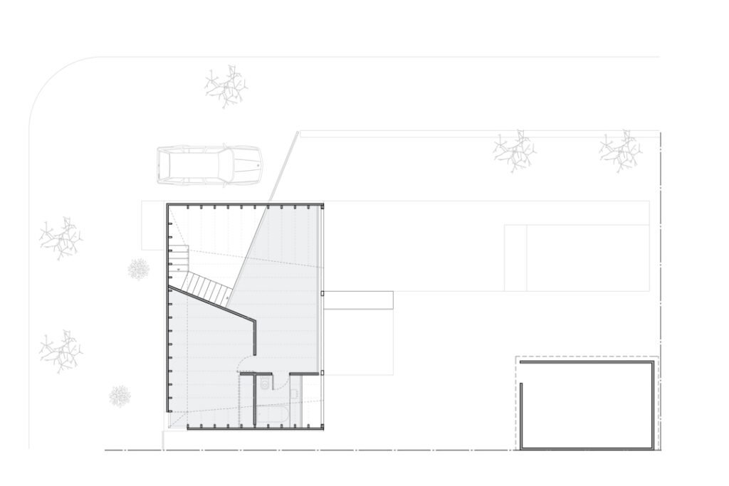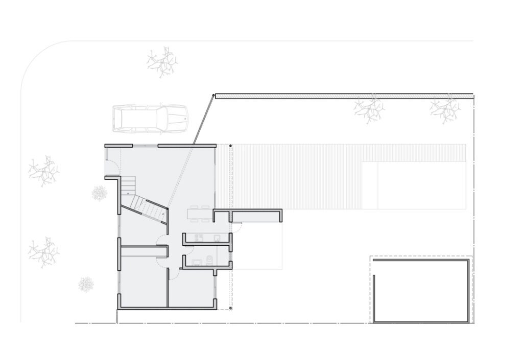 La construcción estuvo marcada por un cuidado minucioso de los detalles: los encuentros entre las nuevas piezas de madera y la base de hormigón, reforzada con perfiles metálicos doble T que permitieron sostener el piso liviano del segundo nivel. La operación generó una doble altura que, desde el acceso, abre la mirada hacia el fondo y hacia arriba, multiplicando la sensación de amplitud. La planta baja también fue ajustada para reforzar esta perspectiva de profundidad.